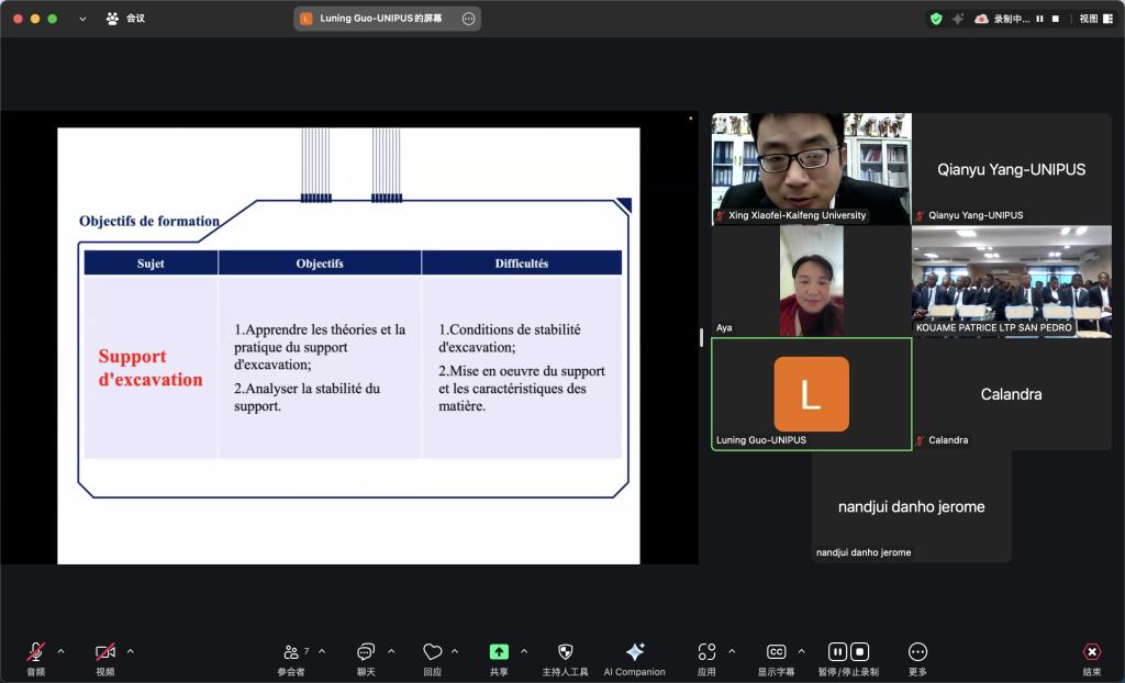 在为期三天的培训中,500余名师生及科特迪瓦当地青年通过线上平台参与学习交流。圣佩德罗职业技术学院的校长 Florent MORIE、培训支持主任 Patrice KOUAME及建筑工程培训教师 Alfred Obha BITTY 亲临现场,积极组织并参与培训。土木建筑工程学院教研室主任邢晓飞担任培训讲师,他凭借深入浅出的讲解,赢得学员的广泛好评。