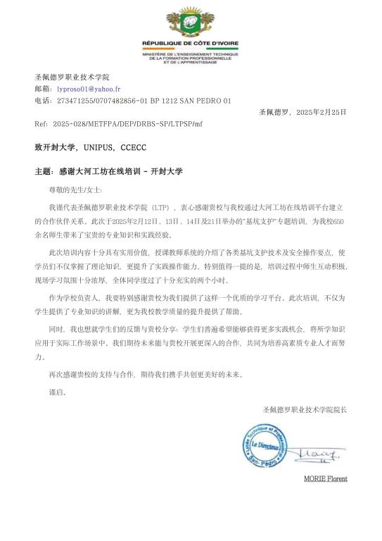 在感谢信中,圣佩德罗职业技术学院院长MORIE Florent表示,本次培训内容紧密贴合实际,实用性极强。学员们不仅系统深入地掌握了基坑支护的相关理论知识,还在实践操作能力上得到了显著提升。