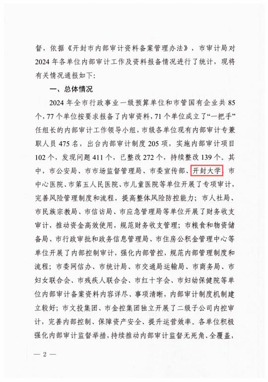 近日,中共开封市委审计委员会办公室、开封市审计局对2024年开封市委各部委、市直各单位、市管企业、高等院校及人民团体的内部审计工作情况进行通报。我校审计处在2024年开展的专项审计工作中表现出色,获通报表扬。