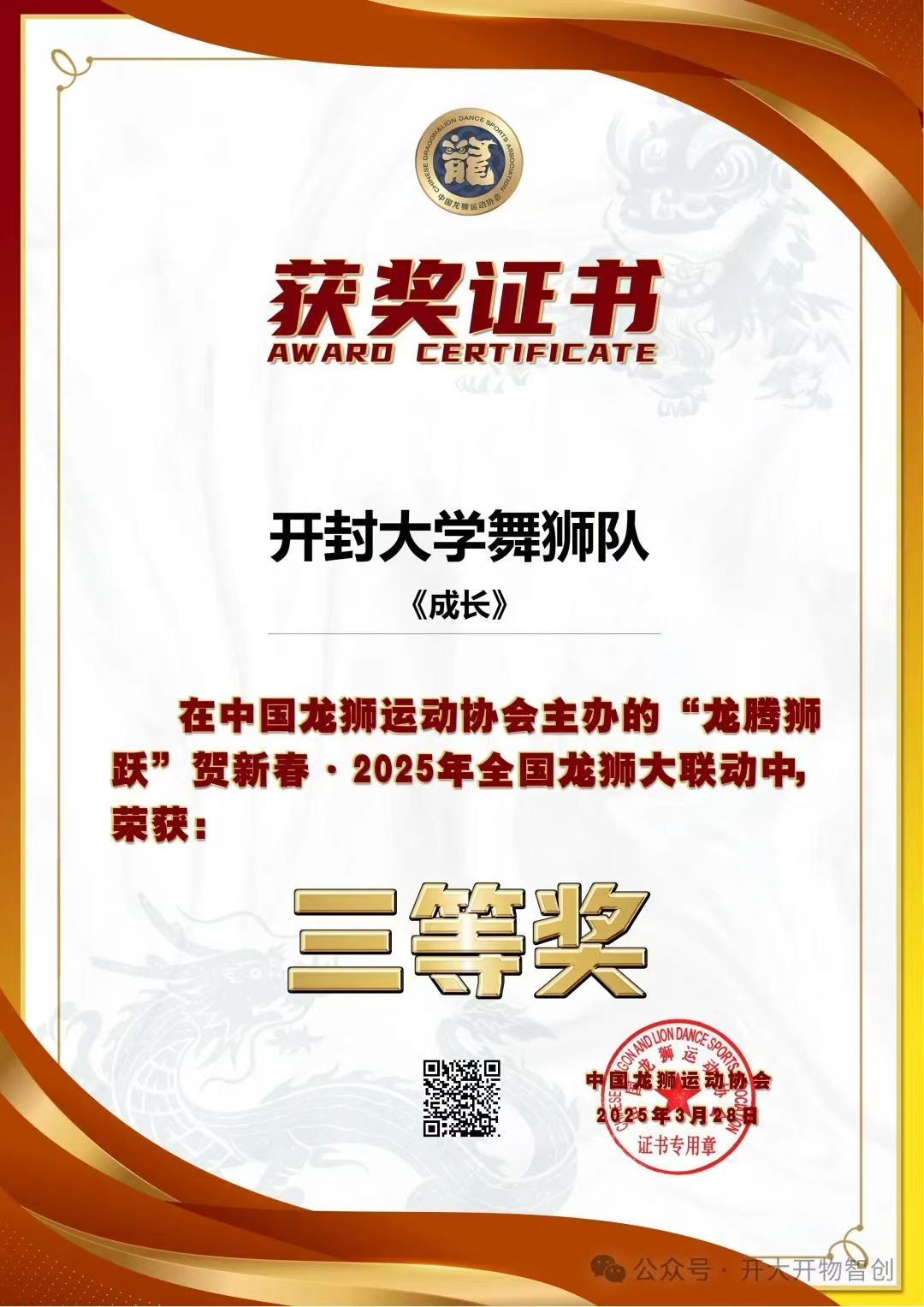 近日,在中国龙狮运动协会“龙腾狮跃”贺新春·2025中国龙狮大联动活动中,我校舞狮社团的参赛作品《成长》荣获三等奖。