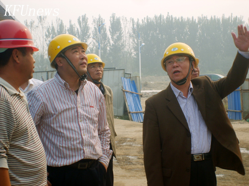 本站讯 10月9日下午,校长拜五四来到北校区建筑工地视察指导工作。拜校长在北校区建设指挥部指挥长储建新陪同下,首先来到已在建设中的C区教学楼施工现场,详细了解工程进展情况和建设中的相关问题,要求施工单位要按照工期安全施工并确保工程质量。随后,拜校长又来到建设指挥部,听取了关于北校区近期建设工程的总体情况的汇报,进一步强调要加快建设进度,打造放心工程。