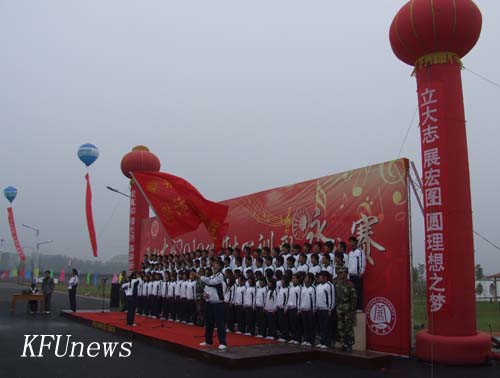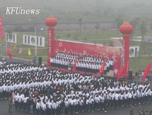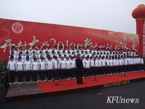 拉练队伍走进东京大道校区时,校内南北主干道的两侧是整齐的欢迎人群,他们是刚刚晨训结束的东京大道校区新同学。拉练队伍踏着整齐的步伐,挥舞着院旗,再加上沿途的欢呼声,东京大道校区成了欢乐的海洋。拉练队伍全部在东京大道校区操场集结完毕,上午9时,新生军训歌咏比赛正式开始。副校长万是明,学工部部长陈岩,军训团有关领导和各院部党总支副书记出席并观看比赛。