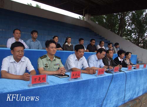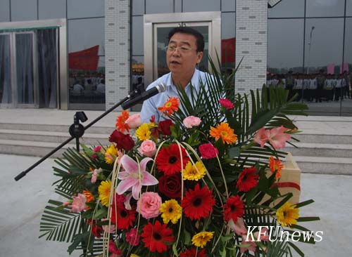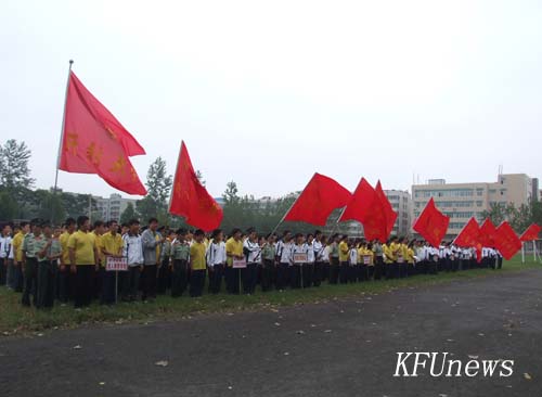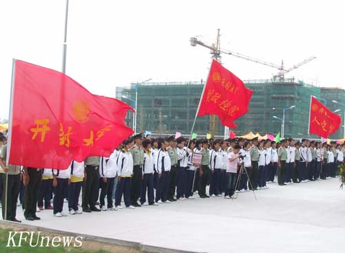 大会在庄严的国歌声中开始。党委书记莫华林代表学校向军训团授旗。校长拜五四代表党委、行政和全体师生员工致辞。他说,“同学们经过了十年寒窗苦读,终于走入梦寐以求的大学殿堂,开始了人生崭新的一页。它既是对前成绩的肯定,也是一个重要的起点,为此,同学们应珍惜机遇,刻苦学习,立志创新,把自己塑造成社会的有用之才,肩负起实现民族复兴的时代重任。为了使同学们在大学生活中路走的更直、脚跟站得更稳、意志更坚定、步伐更豪迈,学校给大家安排的大学第一课就是接受军事训练。要学习人民军队的优良传统和过硬作风,领略革命军人的高尚情怀与风采。”