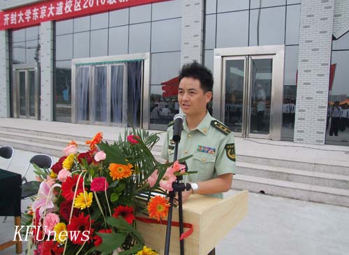 教官代表和新生代表相继发言。新生代表代表2010级全体同学向各位首长、教官、老师们做出承诺:一切行动听指挥,服从教官的管理,虚心向教官学习;严格要求,严格训练,努力完成规定的军训任务;搞好宿舍的内务卫生,保持良好的内务秩序;努力战胜困难,战胜自我,拼搏向上,严守纪律。