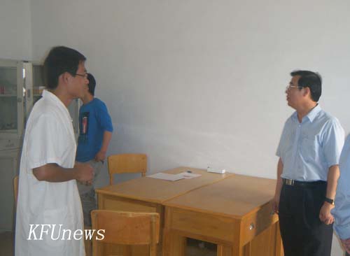 拜校长在新校区医务室,询问医务人员关于近期学生的身体状况,并和新校区的同学交谈,鼓励同学们尽快适应新环境,展现新面貌,创造新成绩。