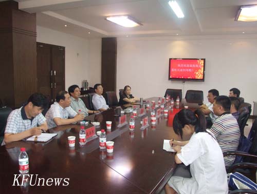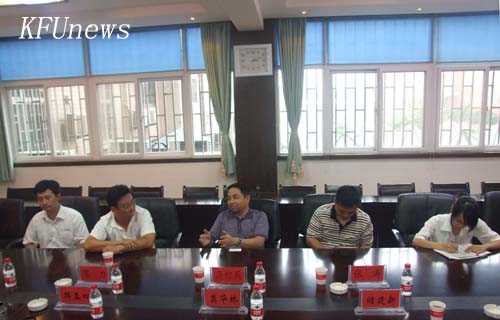 本站讯 8月13日下午,我校校友、开封欧帕自动化有限公司总经理范红兵返回母校,把打算向母校捐赠一部价值近40万元校车的心愿告诉母校,带着感恩母校培育之情,向开大30年校庆献礼。校领导莫华林、拜五四、储建新,以及相关部门负责人在行政楼二楼会议室接待了范红兵校友一行,并就捐赠程序、形式和手续等细节问题进行了商谈。
