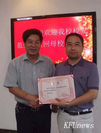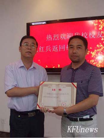莫书记和拜校长还分别为范红兵校友颁发了我校大学生职业指导特聘教授和开封市校友会副会长聘书。