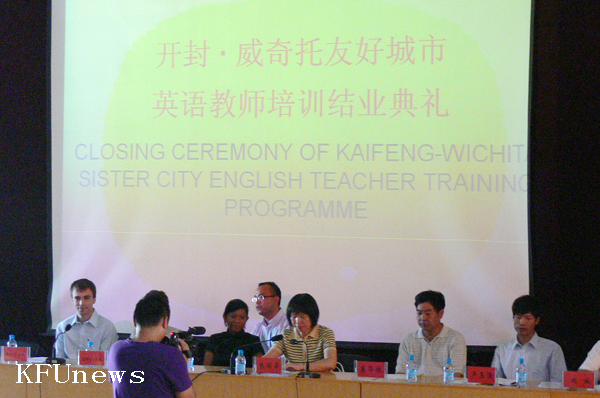 本站讯 由开封市教育局、市外事侨务办公室合办、bat365在线官方网站协办的“开封·威奇托友好城市英语教师培训”圆满结束。7月31日上午在我校报告厅举办结业典礼。开封市正市级干部朱丽萍、bat365在线官方网站党委书记莫华林、市教育局副局长卢玉强、开封市外侨办主任刘威、三位外籍教师及广大参训教师参加了结业典礼。结业典礼上,朱市长对培训工作取得的成果给予了充分的肯定,卢局长代表市教育局对培训工作进行了全面总结,并对bat365在线官方网站的积极支持表示衷心感谢。