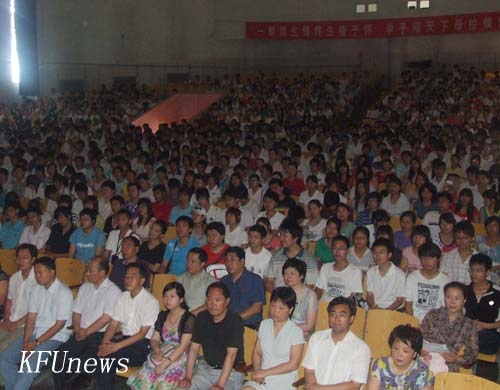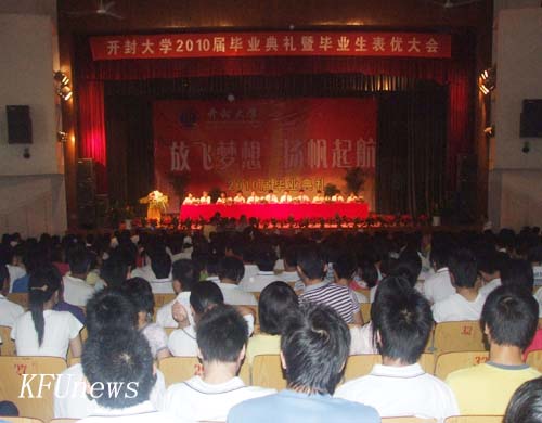 本站讯 6月15日,放飞梦想 扬帆起航,是个让开大人记忆的喜庆日子,3000余名师生欢聚在我校金松大礼堂,隆重举行2010届毕业生毕业典礼。校领导莫华林、拜五四、储建新、万是明、赵辉、范金梅、何世玲、杜爱灵、杨树,党委委员、党政办公室主任成芳出席典礼并在主席台就座,相关处室负责人、部分院部领导、教职工代表和毕业学生家长代表参加。毕业典礼由学生工作处处长陈岩主持。