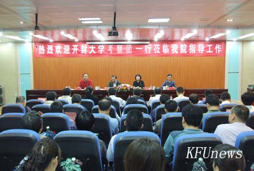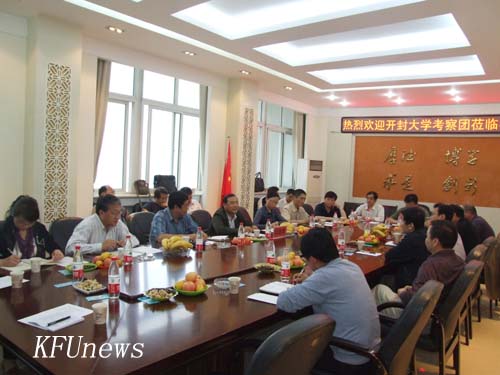 考察组一行22人首先到平顶山学院学习考察。平顶山学院党委副书记窦效民,以及该院党办、院办、组织部、宣传部主要负责人对我校一行表示热烈的欢迎。 在该院办公楼四楼会议室,窦效民副书记向我们介绍了该院的发展历史、办学定位、办学特色、管理模式和运行机制,以及在人才培养、科学研究、队伍建设等方面取得的成绩。我校考察组的同志们无不为他们发扬艰苦奋斗精神,迎难而上,乐于奉献,扎实工作的精神而感染。该校党委组织部部长田建伟、党委宣传部部长侯延民、院办主任李宏亭在座谈会上分别介绍了学校党的组织建设、干部队伍建设、宣传思想工作、高校行政、财务、事务等管理方面的基本做法和经验。我校储书记在座谈会上绍了学校的基本情况,他认为两校办学体制相近,近几年,平顶山学院在条件非常艰苦的情况下发展迅速,取得了显著成就,这种艰苦创业的精神值得学习,对我校办学有很大的启发,希望两校在交流中互相学习,共同进步。