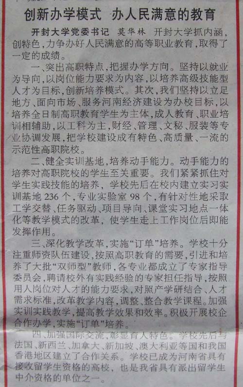 党委书记莫华林撰写的“创新办学模式 办人民满意的教育 ”被2010年5月19日河南日报第9版发表。原文如下:
