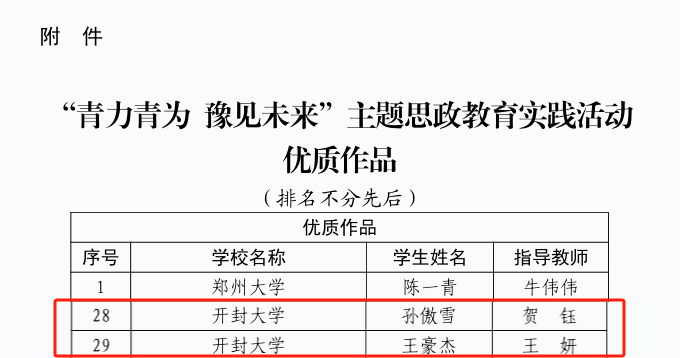 (来源:搜狐) 近日,中共河南省委教育工委、河南省教育厅公布“青力青为豫见未来”主题思政教育实践活动优质作品获奖名单,由我校信息工程学院教师贺钰指导、孙傲雪同学创作的作品,以及艺术设计学院王妍教师指导、王豪杰创作的作品从全省35.3万件参赛作品中脱颖而出,双双入选35项省级优质作品,彰显了学校思政教育与专业实践深度融合的育人成效。