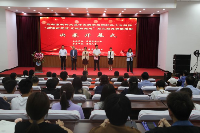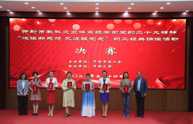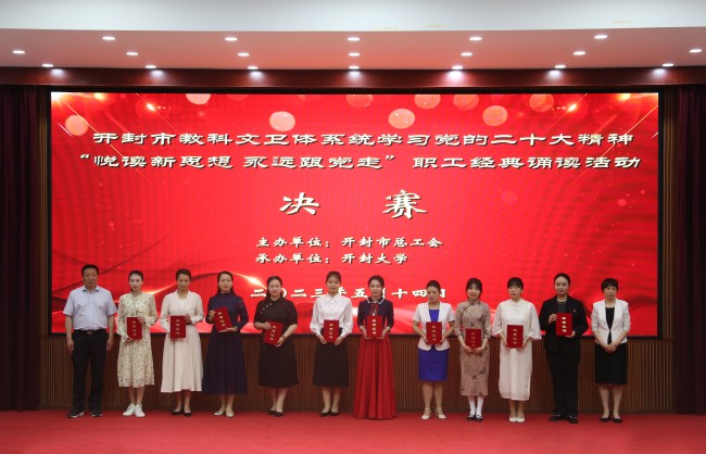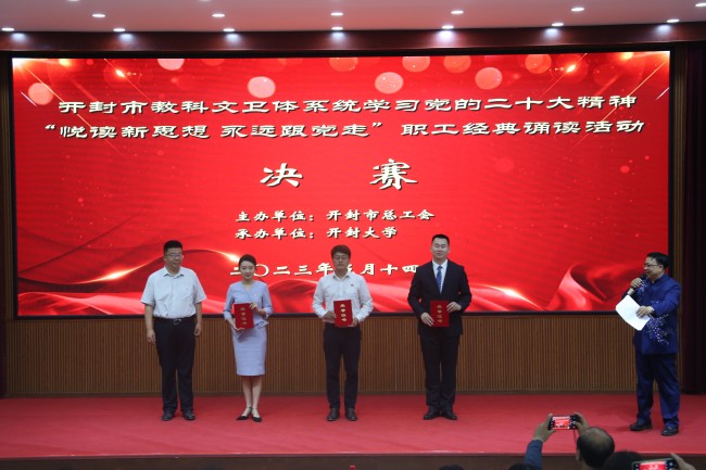 本站讯 5月14日,由开封市总工会主办,我校承办的学习党的二十大精神“悦读新思想 永远跟党走”职工经典诵读活动决赛在我校落下帷幕。来自我市17个单位的20个优秀作品进入决赛。开封市总工会党组书记、常务副主席牛彦斌,校党委书记陈灿,党委副书记储建新,党委委员、工会主席成芳,开封市教科文卫体工会主席王建立出席开幕式并观看了比赛。开封市教科文卫体系统各工会负责人、我校100名学生代表参加了活动。开幕式由开封市总工会党组成员、副主席张红主持。