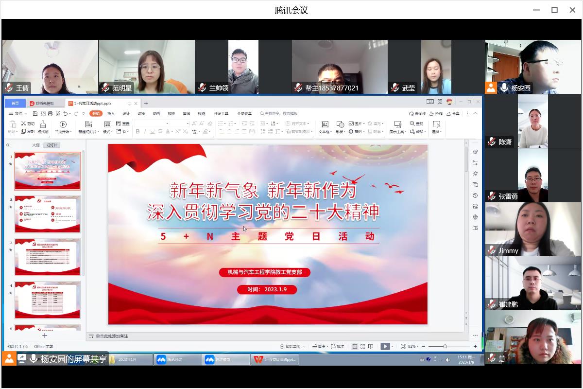 本站讯 1月9日下午,我院教工一支部和二支部以线上形式联合开展“新年新气象,新年新作为,深入学习贯彻党的二十大精神”主题党日活动。全体党员教师参加了主题党日活动,活动由教工二支部书记杨安园主持。