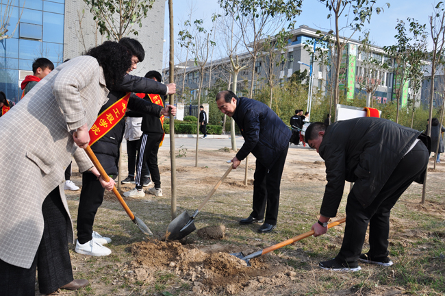 植树活动现场,师生们热情高涨,二人一组或三人一块,配合默契,挥锹铲土、扶苗填坑,规范认真。储书记一边和大家一起栽树培土,一边和身边的师生分享了植树的感受。