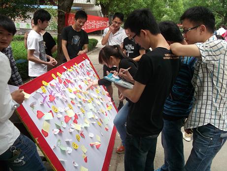 活动主要以卡片寄语形势开展,主办方向同学们发放便利贴,收集他们对毕业生的温情寄语,内容丰富多样,有对学长学姐亲切关爱的感恩,有对他们离校的难舍之情,更多的则是对毕业生在以后人生道路上的鼓舞。主办方把写有祝福语的便利贴贴在展板上以供同学们阅读观看。