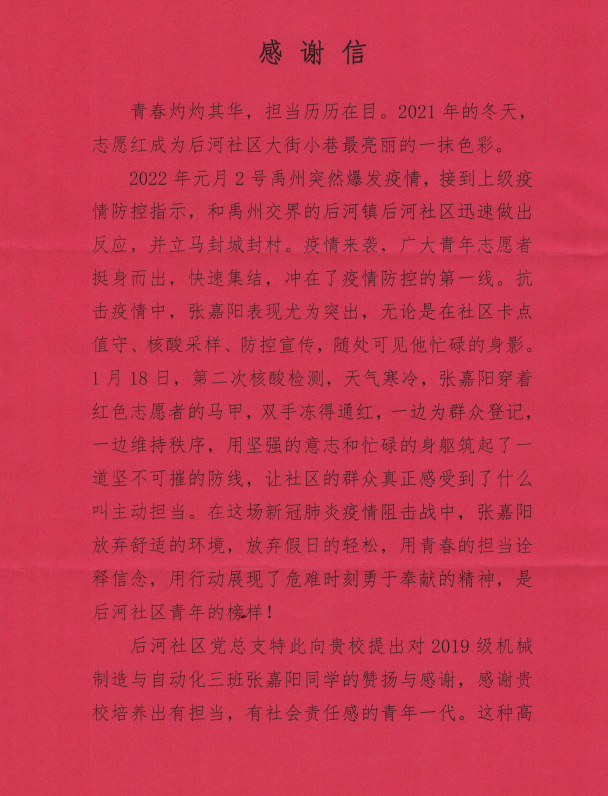 学院先后收到来自中共大马乡委员会、中共商丘市睢阳区闫集镇委员会、中共长葛市后河镇后河社区党总支的三封感谢信,分别对2021级赵建峰、2020级张亚楠、2019级张嘉阳等3名学生参加家乡疫情防控工作和基层社会实践的突出表现给予了高度评价和赞扬,肯定了他们的舍己为人、无私担当、甘于奉献精神。