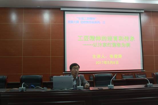这次讲座是我院技能大师进校园活动的第三次讲座,我们邀请到的是开封汴京灯笼张彩灯展览馆馆长,汴京灯笼张第七代传人张俊涛先生。张俊涛先生此次讲座以“”工匠精神的培育和传承”为主题,结合自身的成才经历,向广大学生阐述了青年学生为什么要发扬工匠精神,为什么要传承祖国悠久的历史文化,要肩负起青年大学生的历史责任感和使命感。