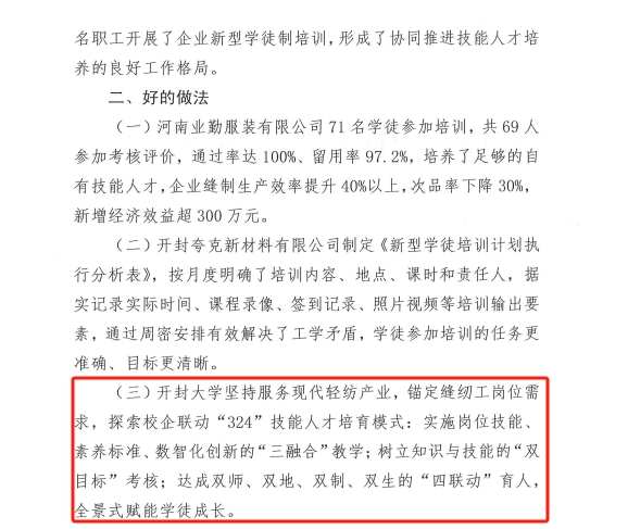 在新型学徒制培训工作中,艺术设计学院坚持服务现代轻纺产业,锚定缝纫工岗位需求,与河南业勤服装有限公司合作,学徒进行培训并参加考核,通过率达100%;材料与化学工程学院与开封夸克新材料有限公司联合开展培训,深化校企沟通协作,优化资源配置。我校与企业联合开展的新型学徒制培训,推动开封市企业职工技能提升,形成技能人才培养的协同格局,实现“学校-企业-社会”多方共赢。