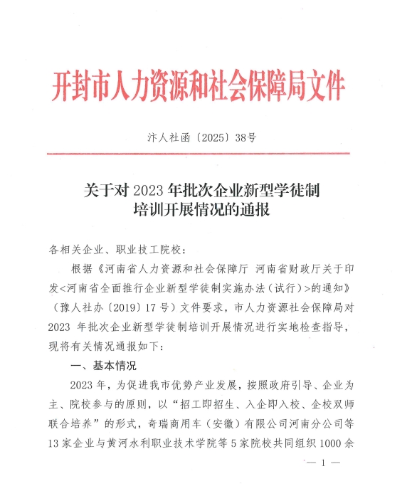 近日,开封市人力资源和社会保障局对2023年批次企业新型学徒制培训开展情况进行通报,我校在新型学徒制培训工作中表现出色,获通报表扬。