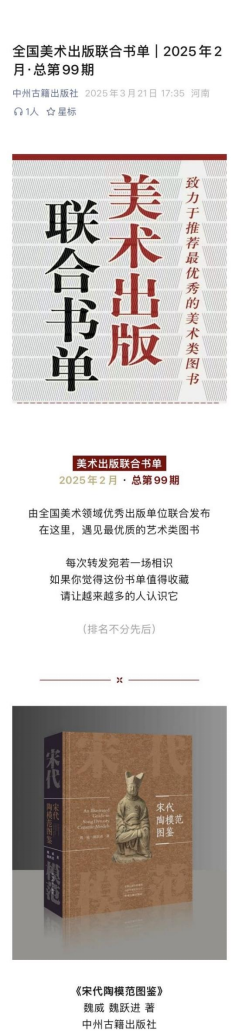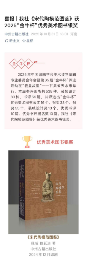 近日,第 35 届 “金牛杯” 全国优秀美术图书终审评选圆满落幕。由我校魏威、魏跃进两位老师合著,中州古籍出版社出版并推荐的著作——《宋代陶模范图鉴》历经初评、复评、终评三轮严格遴选,最终脱颖而出,荣获优秀美术图书奖银奖。