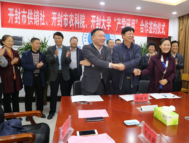 10月30日上午,我校与开封市供销社、开封市农业科学研究院战略合作协议签约仪式在行政楼三楼会议室举行。开封市供销社主任樊军科、李付社;开封市农林科学研究院党委书记、院长王培云,研究员谷建中,纪检监察室主任马骥,科研管理科科长李传强;杞县工作队主任胡涛;我校校长宋志敏和党政办公室、教务处、科研规划处、对外交流与合作处、机械与汽车工程学院、材料与化学工程学院、信息工程学院、财政经济学院及旅游学院负责人出席了签约仪式,签约仪式由党政办公室主任张庆丰主持。