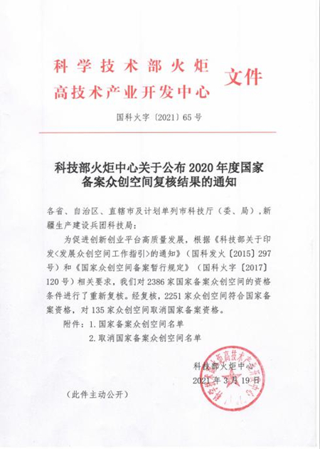 近日,科技部火炬中心发布了《关于公布2020年度国家备案众创空间复核结果的通知》(国科火字〔2021〕65号),我校“bat365在线官方网站众创空间”顺利通过科技部火炬中心2020年度国家备案众创空间复核,继续保留国家备案资格。