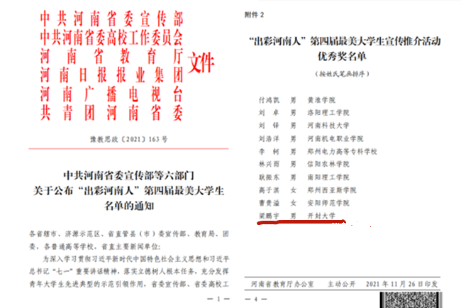 近日,“出彩河南人”第四届最美大学生宣传推介活动结果公布,我校土木建筑工程学院2019级房地产经营与管理专业学生梁鹏宇获优秀奖,这是我校学生首次获此殊荣。