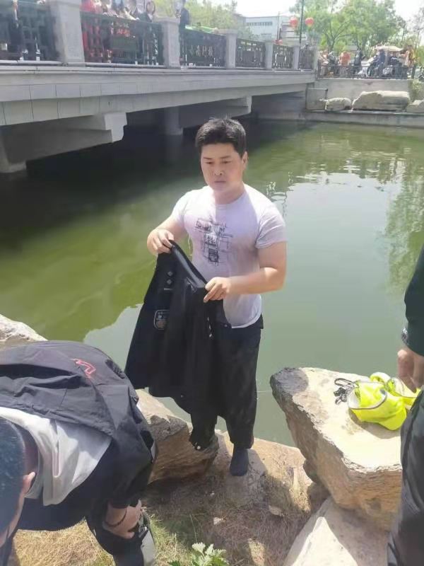 接到求助的郑熠阳快速跑到河边,顾不上多想飞身一跃跳进河中,奋力将落水儿童拽出水面。在随后赶到的交警袁素强、唐恒的帮助下将孩子拉到岸上。