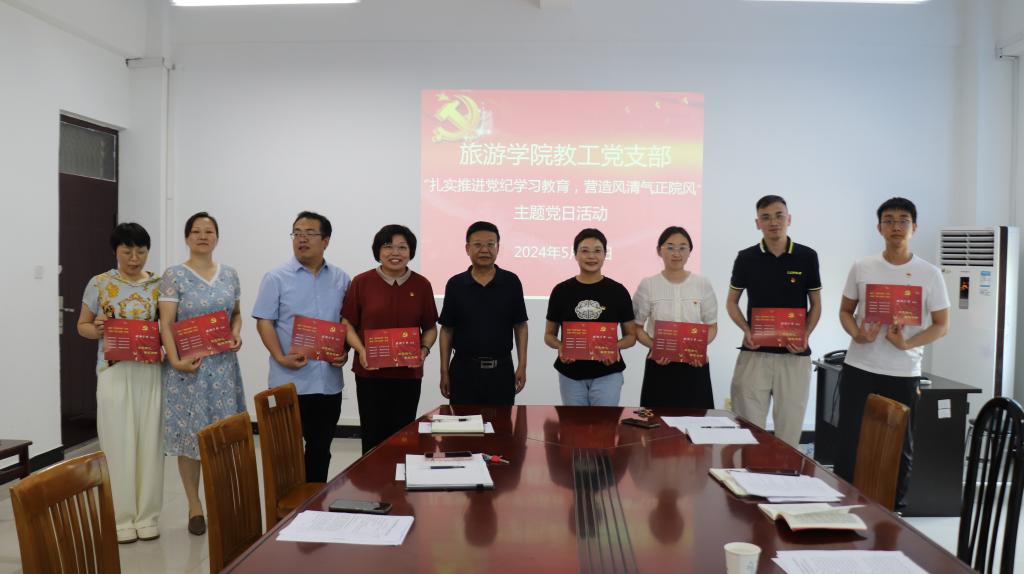 5月23日,旅游学院教工党支部在学院会议室召开“扎实推进党纪学习教育,营造风清气正院风”主题党日活动,校党委委员、副校长万是明同志及学院全体教工党员参加,活动由学院党总支书记尤影同志主持。