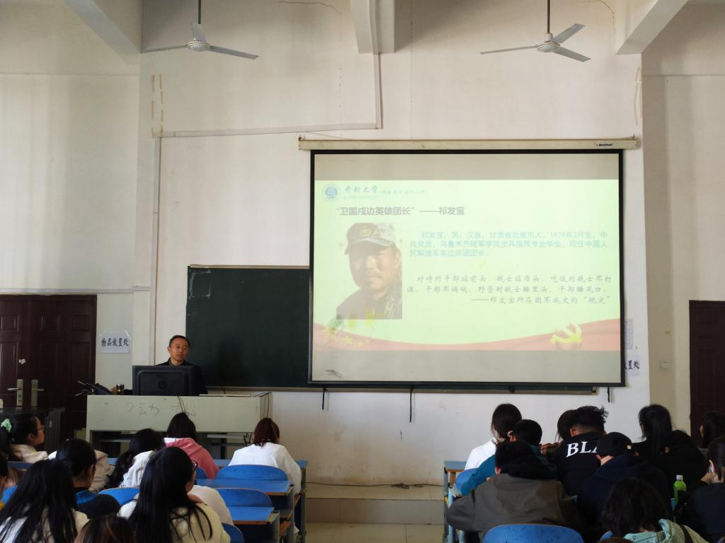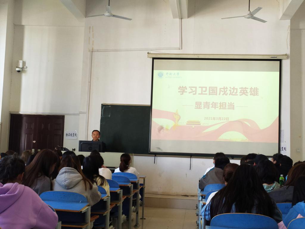 活动中,李治校长为师生们生动地上了一堂题为“学习卫国戍边英雄,显青年担当”的红色思政课。通过课件,李校长向师生们讲述了卫国戍边英雄祁发宝、陈红军、陈祥榕等英雄的感人事迹。他强调道:“今年是我们党建党100周年,我们更要心怀党恩,团结在党的旗帜下,发扬传统,艰苦奋斗,坚定理想信念,爱岗敬业,做好本职工作,履行好大学生肩负的时代责任和历史使命,做一名德才兼备、又红又专、全面发展的新时代中国特色社会主义建设者和可靠接班人。我们要将喀喇昆仑边防战士的爱国奉献精神与自己融为一体,深刻感受到那份责任与意识,将其转化为动力,不断督促自己,激励自己,让自身发光发热,为国家、为人民燃烧自己。”
