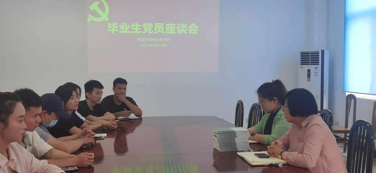进一步加强党员教育、管理和服务长效机制的落实,做好2021届毕业生党员离校教育,旅游学院于6月10日下午召开毕业生党员座谈会,学院党总支书记尤影、学生党支部组织委员袁安娜以及2021届毕业生党员参加会议。