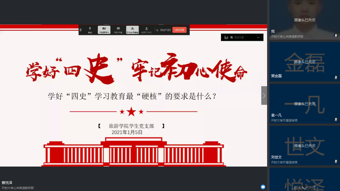 为学好党史、新中国史、改革开放史、社会主义发展史,旅游学院学生党支部于1月5日在钉钉会议开展了“学好四史,牢记初心使命”主题党日活动,旅游学院学生党支部全体学生党员参与了本次活动。
