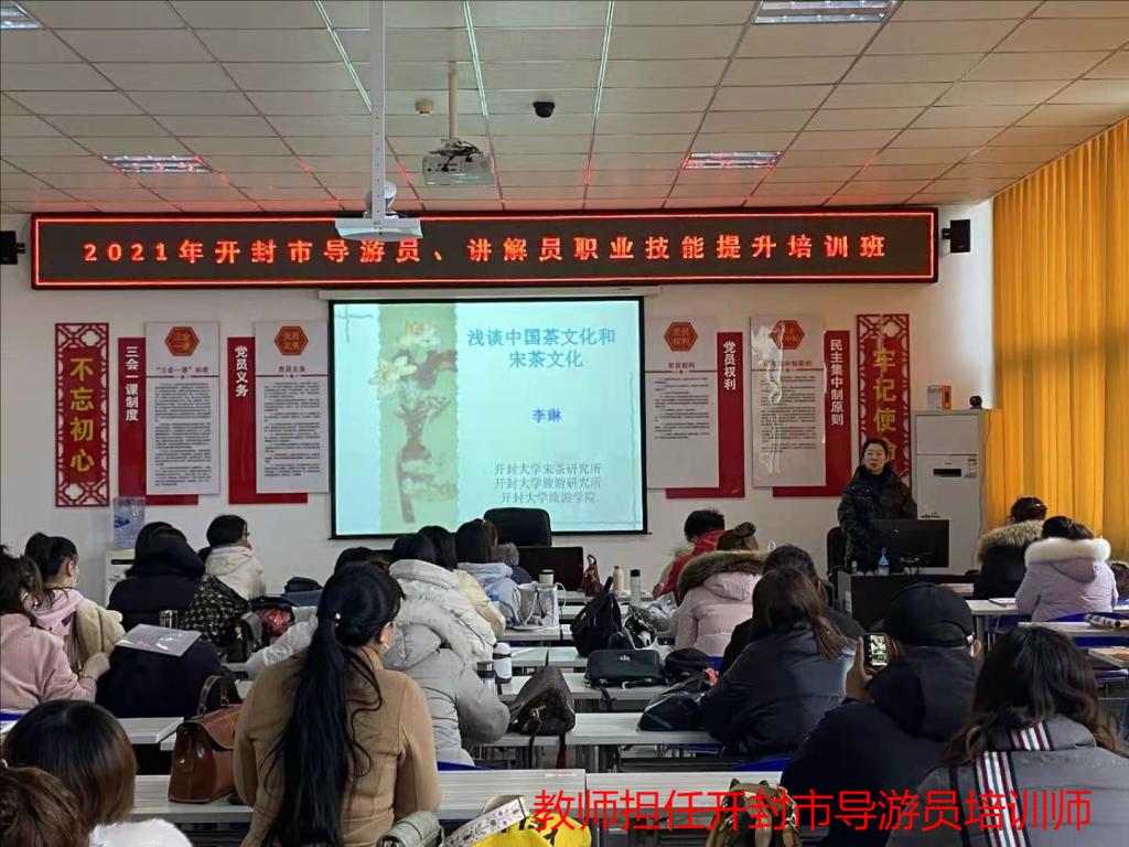 受河南省旅游局委托开展高星级酒店星级评定性复核工作,邀请政府主管部门、高校学者、业内专家成功举办开封市旅游发展研讨会,开封市旅游职业教育研讨会。学院教师多次受邀参加开封市旅游委主任会议,参与开封自贸区与全域旅游专题研讨、开封市旅游产业相关政策制定,参加以开封市人民政府为发起单位的“一带一路”城市旅游联盟相关活动,参加《开封市西湖生态风景区总体规划》、开封府二期规划、清明上河园三期规划论证评审、开封礼物评审等工作,派出专业教师担任开封市导游大赛评委,并为开封市参加河南省第四届导游大赛选手培训。2017年旅游学院再次当选河南省旅游协会旅游教育分会副会长单位、开封市茶文化研究会副会长单位。2021年3月旅游管理专业教师受开封市文化广电和旅游局邀请,开展开封市导游员(讲解员)职业技能提升培训,主要承担中国茶文化和宋茶文化的培训任务,为提升开封旅游从业人员素养,打造世界历史文化名都提供智力支持。