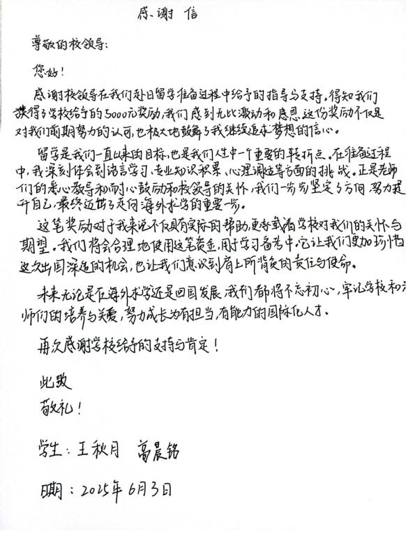 本站讯  近日,我校国际教育学院(外国语学院)应用日语专业交换生王秋月、高晨铭从日本观光大学传来佳讯,两位同学以优异表现荣获bat365在线官方网站交换生项目学业优秀奖学金,并联合致信学校,深情表达对学校悉心培养的感激之情,字里行间洋溢着对师长教诲的感恩与对专业成长的热忱。