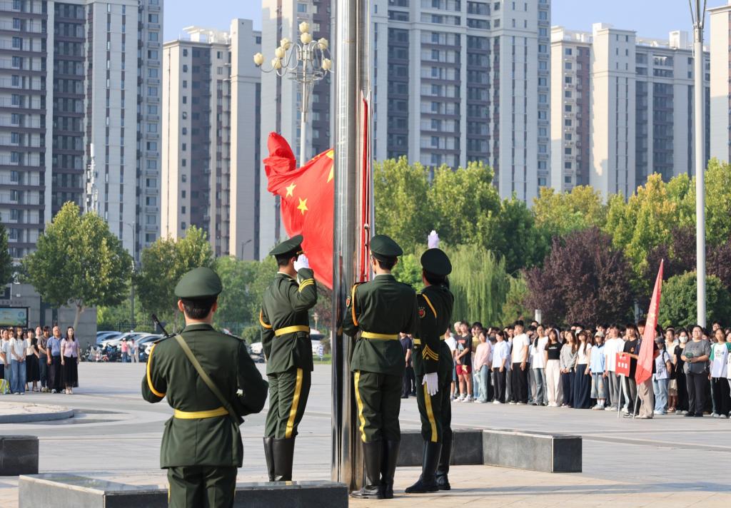 仪式现场,国旗护卫队队员矫首昂视、精神抖擞,迈着铿锵步伐护送五星红旗向国旗台行进。伴随雄壮的《义勇军进行曲》,五星红旗冉冉升起,全体师生肃立,行注目礼。教务处处长王茜、2024级国际教育学院学生田柯萱分别作为教师代表与学生代表发言。