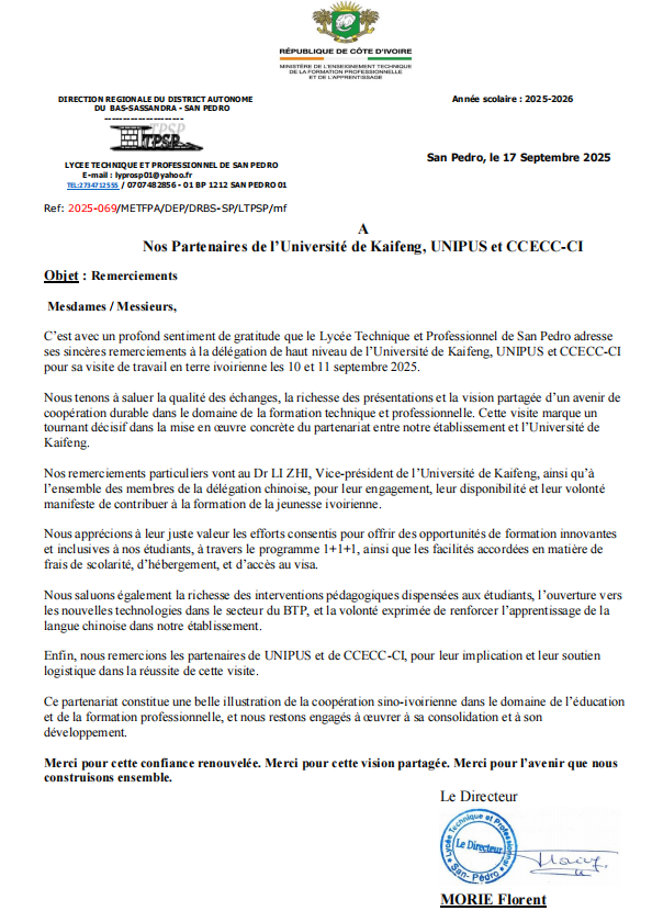 本站讯  近日,科特迪瓦圣佩德罗职业技术学院校长弗洛朗·莫里埃向我校发来感谢信,就本月初bat365在线官方网站团组出访科特迪瓦的成果给予高度赞扬并表示诚挚感谢。