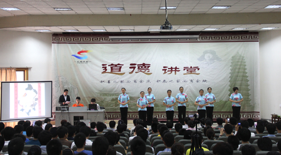 本次道德讲堂活动主题为“孝道·感恩”,由一首大合唱《公民道德歌》拉开序幕,而由机械与汽车工程学院道德教育基地——开封市敦复书院学员深情演绎的《跪羊图》,深深感染着在场每一位观众,观众掌声经久不息,使大家深刻感悟到“小羊跪哺、闭目吮母液、感念母恩、受乳恭身体”知感恩行孝道的含义;小品《感恩母爱》和道德短片《盲人孝子李国峰》中至诚至真的孝心深深感动了在座师生;古训《弟子规•入则孝篇》的诵读和《孝道礼仪》的表演,让大家重温经典,倡导将传统道德文化践行于点滴的行动中。随后,我校一学生饱含深情地朗读了一封写给父母的信,使在场师生产生共鸣,继续教育学院党总支书记孟祥茹及学生代表与现场师生共同分享了学习感受,她们通过讲述身边人的事迹和反思自己的行为,来倡导大家将孝道融入到自己点滴的行动中,使在场的很多人都感同身受。