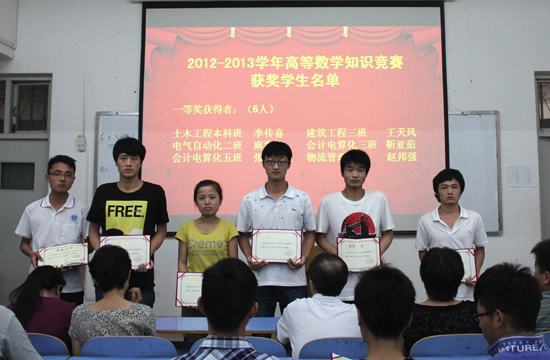 我校高等数学知识竞赛是学生重大知识竞赛活动之一,旨在促进一年级学生学好扎实的基础知识,养成良好的学风;学生从数学课程的学习中得到理性思维能力的提高。在2012—2013学年我校高等数学知识竞赛中,电子电气工程学院2012级电气自动化2班麻群振、财政经济学院2012级会计电算化3班靳亚茹等6位同学获得了一等奖;机械与汽车工程学院2012级汽车检测1班张家奎、电子电气工程学院2012级电气自动化1班李志强等11位同学获得了二等奖;化学工程学院2012级应用化工2班唐伟、旅游学院2012级市场营销班薛伟等17位同学获得了三等奖。
