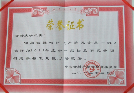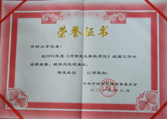 本站讯 近日,从全市纪检监察工作会议获悉,我校荣获2012年度全市纪检监察宣传教育工作先进单位,我校纪委荣获《河南党风廉政建设》组稿工作先进单位和纪检监察优秀调研成果先进单位。
