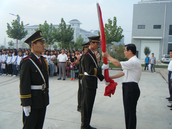 旗手分别从党委书记张新梅和校长拜五四手中迎过国旗,伴随着嘹亮的国歌声,鲜艳的五星红旗冉冉升起,全体师生行注目礼。在飘扬的五星红旗下,我校师生精神焕发,迎来了新的学期。