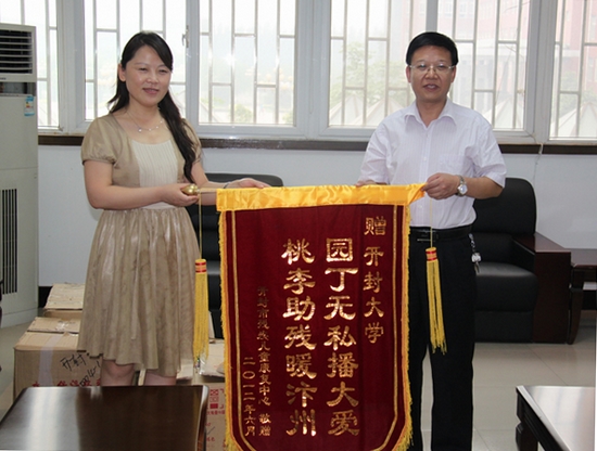 开封市残疾儿童康复中心向我校赠送“园丁无私播大爱,桃李助残暖汴州”的锦旗,对我校的志愿爱心服务表示感谢。