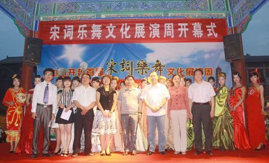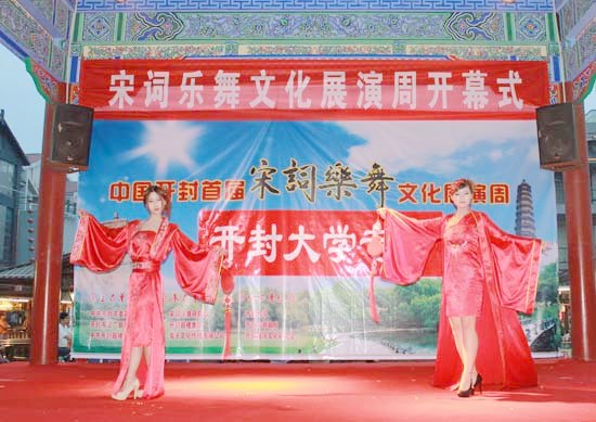 本站讯 5月22日上午,为弘扬开封丰富的文化资源,展示开封博大精深的文化内涵和蓬勃向上的城市形象,由中共市委宣传部等单位主办的中国开封首届宋词乐舞文化展演周在鼓楼食坊隆重开幕。开封市领导秦保强、陈国桢、陈传智等,及我校党委副书记储建新出席开幕式,开封市委常委、宣传部部长秦保强宣布宋词乐舞文化展演周开幕。
