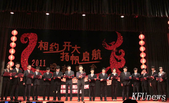 本站讯 为了丰富2011级新生的课余文化生活,进一步促进校园文化建设,由团委主办,校学生会承办的"相约开大,扬帆起航"迎新晚会,于10月13日在金松大礼堂举行。校学生工作部、校团委负责人观看了本场晚会。