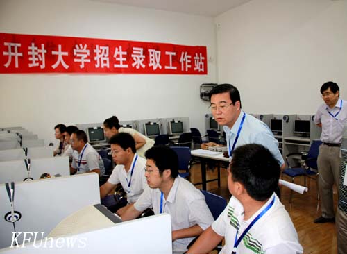 本站讯 8月10日,我校河南省专科一批录取开始。校领导莫华林、拜五四、储建新、赵辉、耿广利一大早来到录取现场,慰问录取工作人员,并要求大家要对考生、对家长、对学校高度负责的态度,严格按照程序和录取规定,认真落实阳光招生工程,确保本批次录取顺利进行。