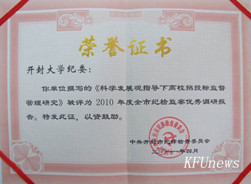本站讯 近日,从开封市纪委获悉,我校纪委主持完成的《科学发展观指导下高校招投标监督管理研究》荣获全市纪检监察优秀调研报告。