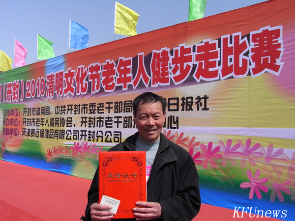 本站讯 4月2日上午,阳光明媚、春意盎然,由开封市体育局、开封市委老干部局、开封日报社联合举办的2010年开封市老年人健步走比赛在美丽的龙亭湖畔拉开帷幕,我校部分老干部代表参加了比赛。比赛中,他们个个青春焕发、精神抖擞,本着“安全第一,健康第一,友谊第一”的精神走完了全程。最后,我校退休教师张德义取得了男子组第七名的好成绩。