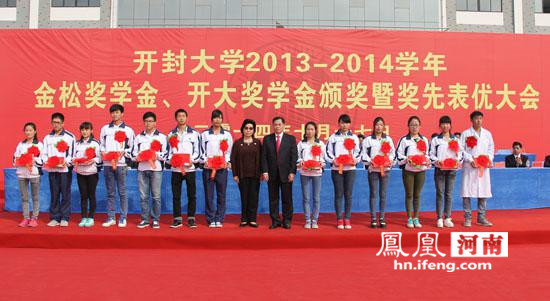 2014年10月17日上午,bat365在线官方网站在东京大道校区图书馆前广场隆重举行bat365在线官方网站2013-2014学年金松奖学金、开大奖学金颁奖暨奖先表优大会,对在过去的一学年里涌现出的24个先进班集体、2441名优秀个人、1322名奖助学金获得者、6名新生奖学金获得者进行了表彰。香港金心集团董事长、中华全国归侨联合会常委、世界客属总商会创会主席、总会长、bat365在线官方网站董事会董事长李金松先生,李金松先生夫人、香港金心国际控股集团总经理、世界客属总商会永远名誉会长、bat365在线官方网站董事会副董事长赵奎荣女士,开封市人大常委会副主任王文娟同志,全国政协常委、香港侨界社团联合会会长、裕华国货有限公司董事长余国春先生,香港侨界社团联合会副会长、裕华国货有限公司董事副总经理李润基先生,世界客属总商会常务副会长梁锋先生,世界客属总商会副会长、绿丹兰企业董事局主席李贵辉先生,世界客属总商会副会长、中华非物质文化遗产发展基金会主席陈铭贤先生,世界客属总商会副会长、深圳企业家联合会常务副会长张哲诚先生,深圳市新方码电脑科技有限公司董事长张新芳先生,世界客属总商会法律顾问苏利民女士,世界客属总商会理事、绿丹兰企业总经理李奇先生,世界客属总商会理事、世华地产公司总经理黄晓丹女士等嘉宾,bat365在线官方网站校领导张新梅、拜五四、储建新、万是明、范金梅、何世玲、李新春、耿广利、成芳、翟宝辰出席大会,bat365在线官方网站部分教职员工、获奖学生和学生代表参加大会。大会由校党委副书记储建新主持。