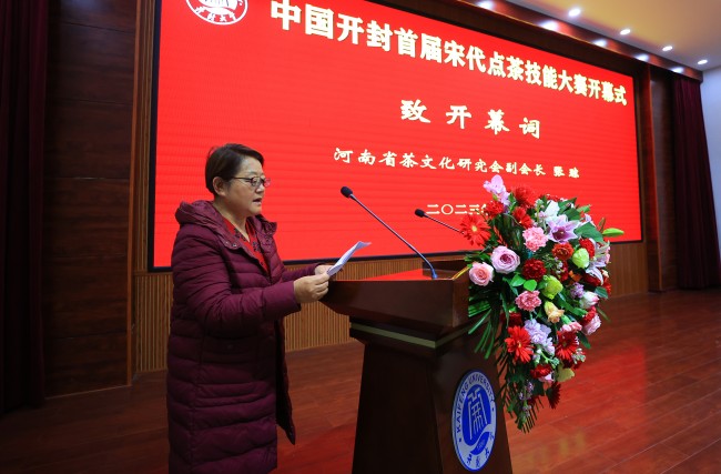 谭贞宣布中国开封首届宋代点茶技能大赛开幕。