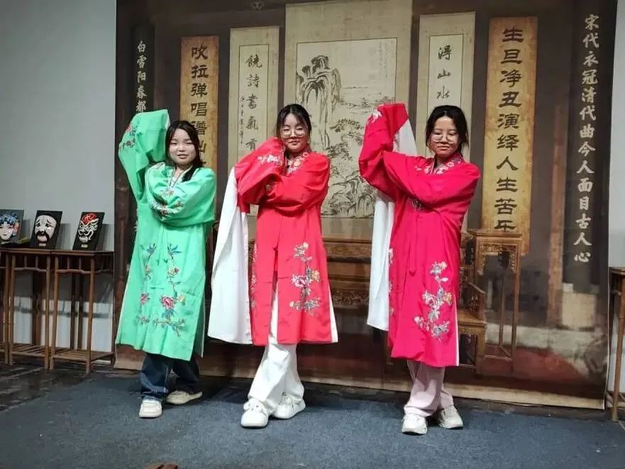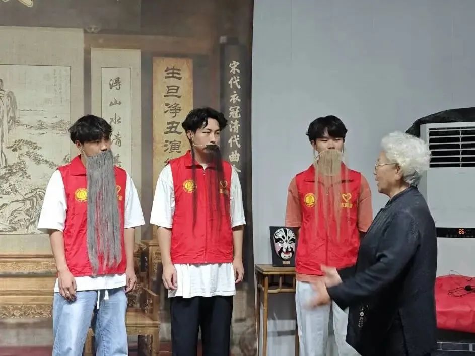 研学过程中,国家级非物质文化遗产二夹弦代表性传承人田爱云,为小分队的师生们详细讲解了二夹弦的历史渊源、艺术特色、发展现状,讲述了她的演艺经历,创办二夹弦戏校的艰辛过程。随后,田爱云为大家演唱了一段二夹弦的代表性曲目,表演了二夹弦不同角色的扮相,演示了二夹弦曲目的标志性动作。成员们戴上“口髯”、穿戴上戏服,学习表演动作,沉浸式感受二夹弦的文化魅力。